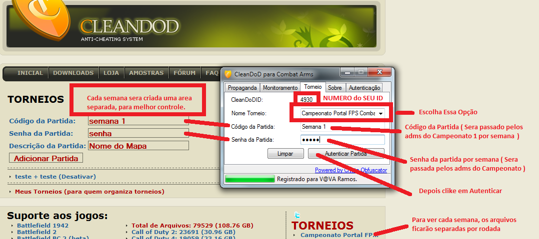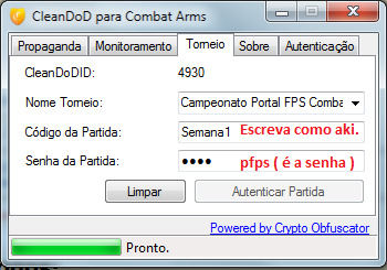 Pessoal, antes de abrir o cleandod em cada jogo do campeonato, vcs terão q selecionar o nome do campeonato e colocar seu código e senha q os administrador do Campeonato irão passar.